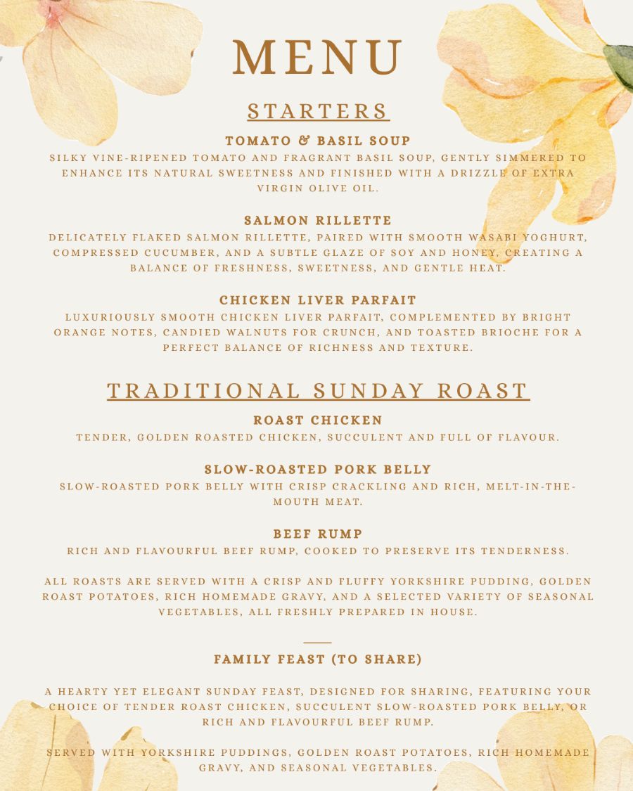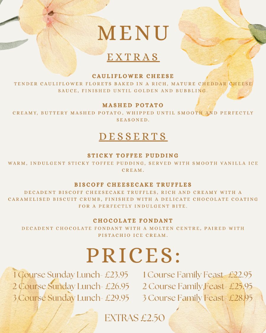 We will be hosting a “Restaurant Style” Sunday Lunch where you can enjoy a delicious, freshly cooked meal, or enjoy our Family Feast option as well.