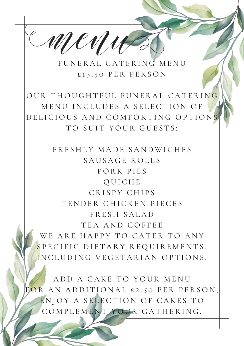 Funeral teas, wakes and memorial celebrations can be both moving and uplifting events. Let our staff help ease the burden of arranging everything at this most difficult time; ensuring that they do not add to the stress of losing a family member or close friend.